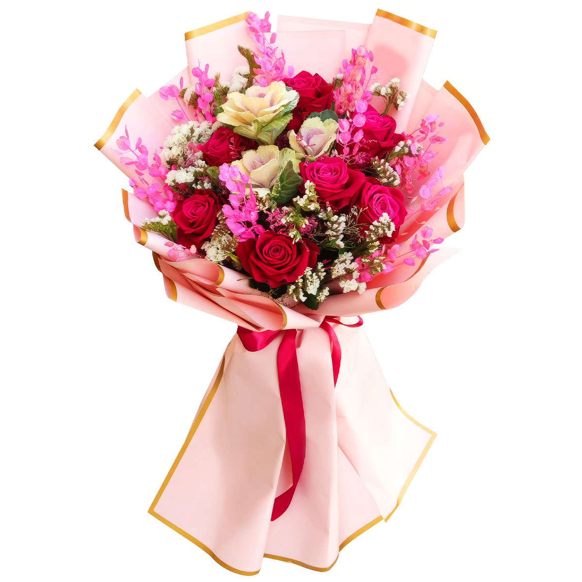 Роза одноголовая розовая, брассика, лунария розовая, статица белая. Упаковка (лента, пленка, крафт, сетка, пленка матовая)