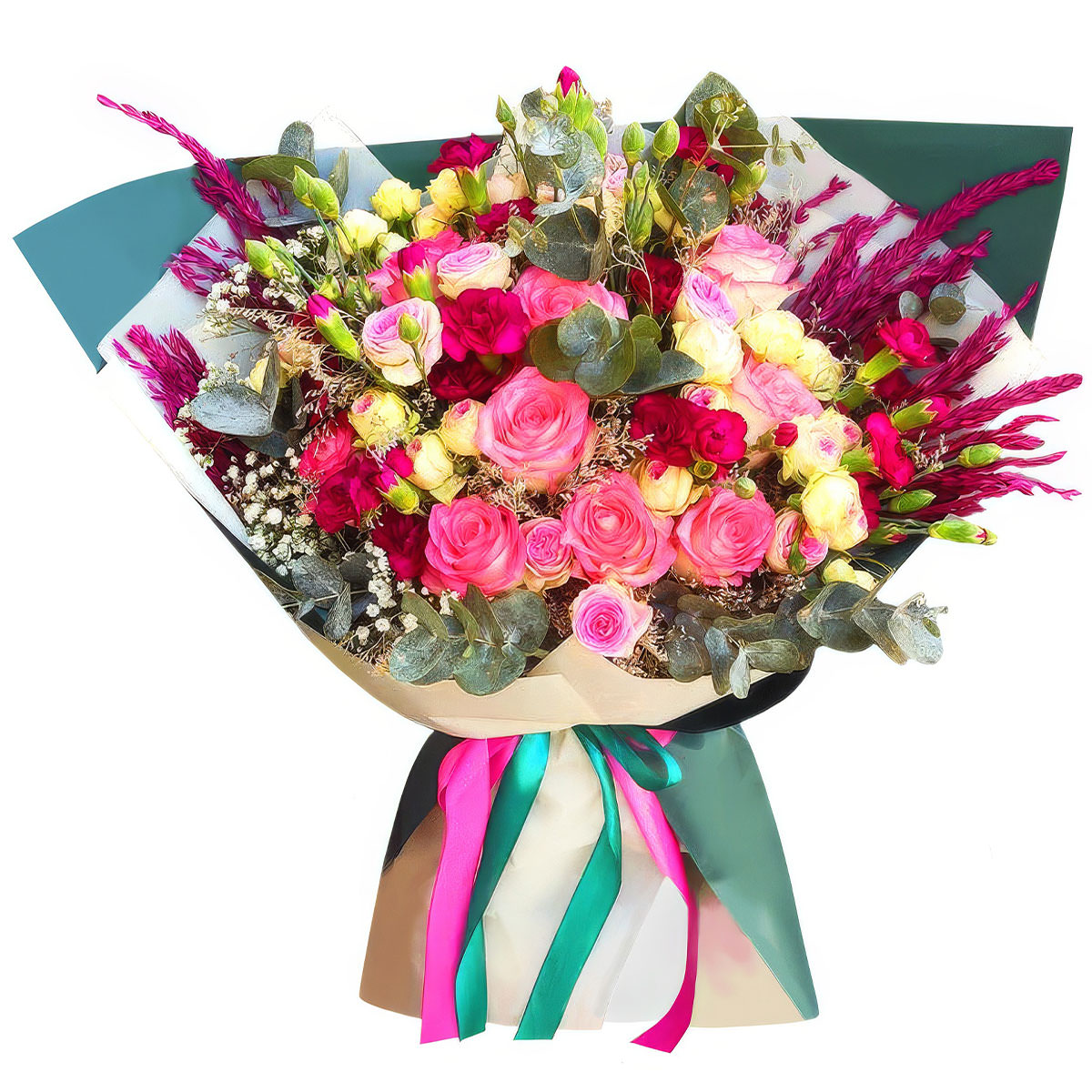 Роза кустовая розовая, роза кустовая пионовидная кремовая, гипсофила, эустома розовая, сухоцветы, эвкалипт. Упаковка (лента, пленка, крафт, сетка, пленка матовая)
