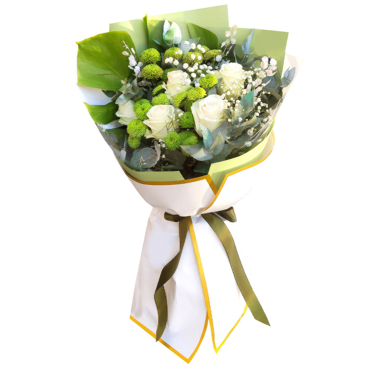 Роза одноголовая белая, хризантема кустовая зеленая, монстера, лунария, гипсофила, эвкалипт. Упаковка (лента, пленка, крафт, сетка, пленка матовая)