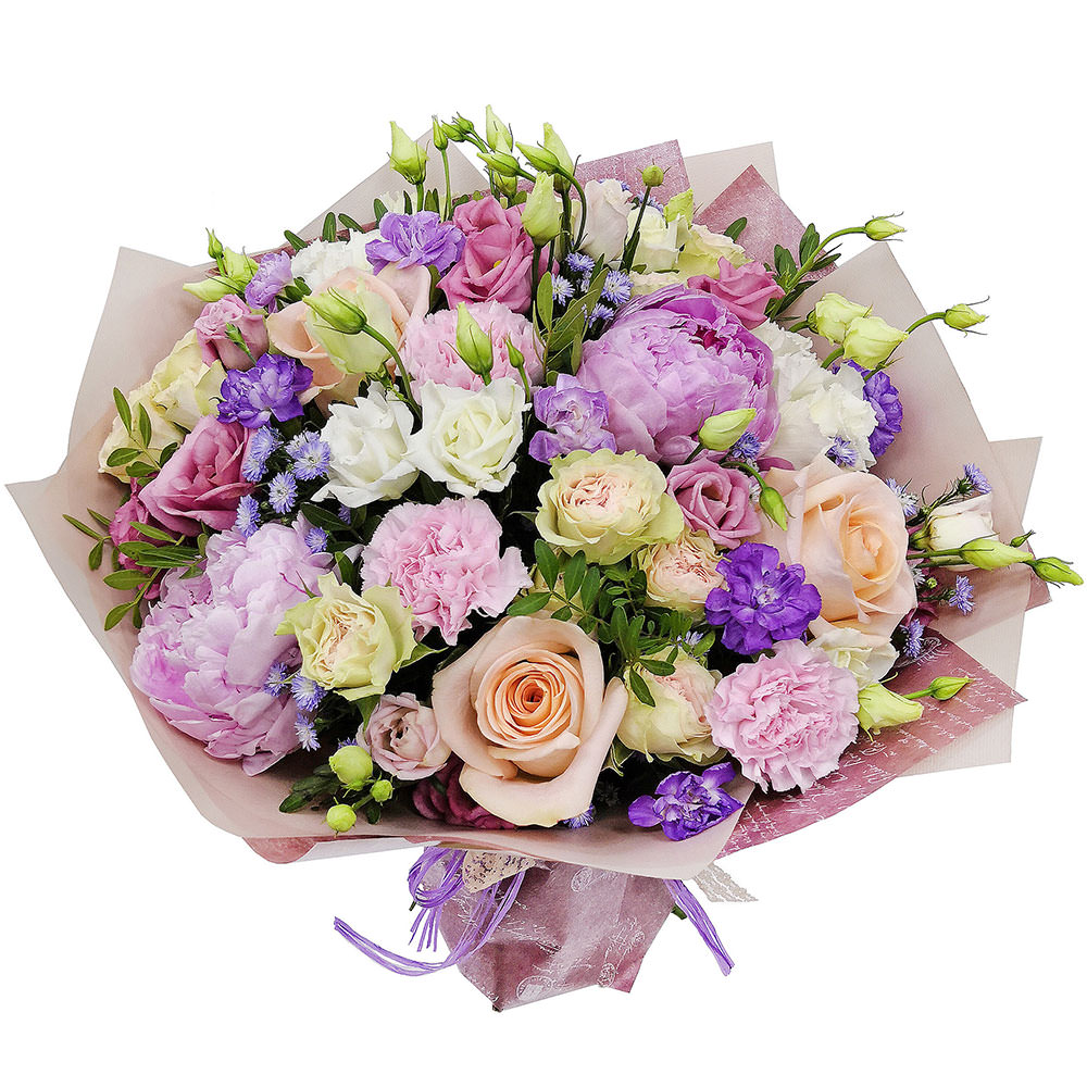 Пион сиреневый, роза кустовая кремовая, роза одноголовая кремовая, гвоздика розовая, эустома розовая, маттиола фиолетовая, фисташка. Упаковка (лента, пленка, крафт, сетка, пленка матовая)