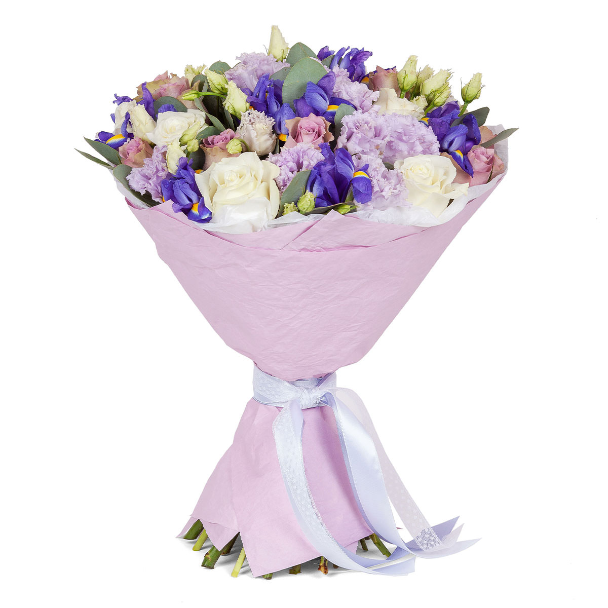| Состав | Ирисы, Кустовые розы, Лавандовые розы, Розы, Эвкалипт, Эустомы |