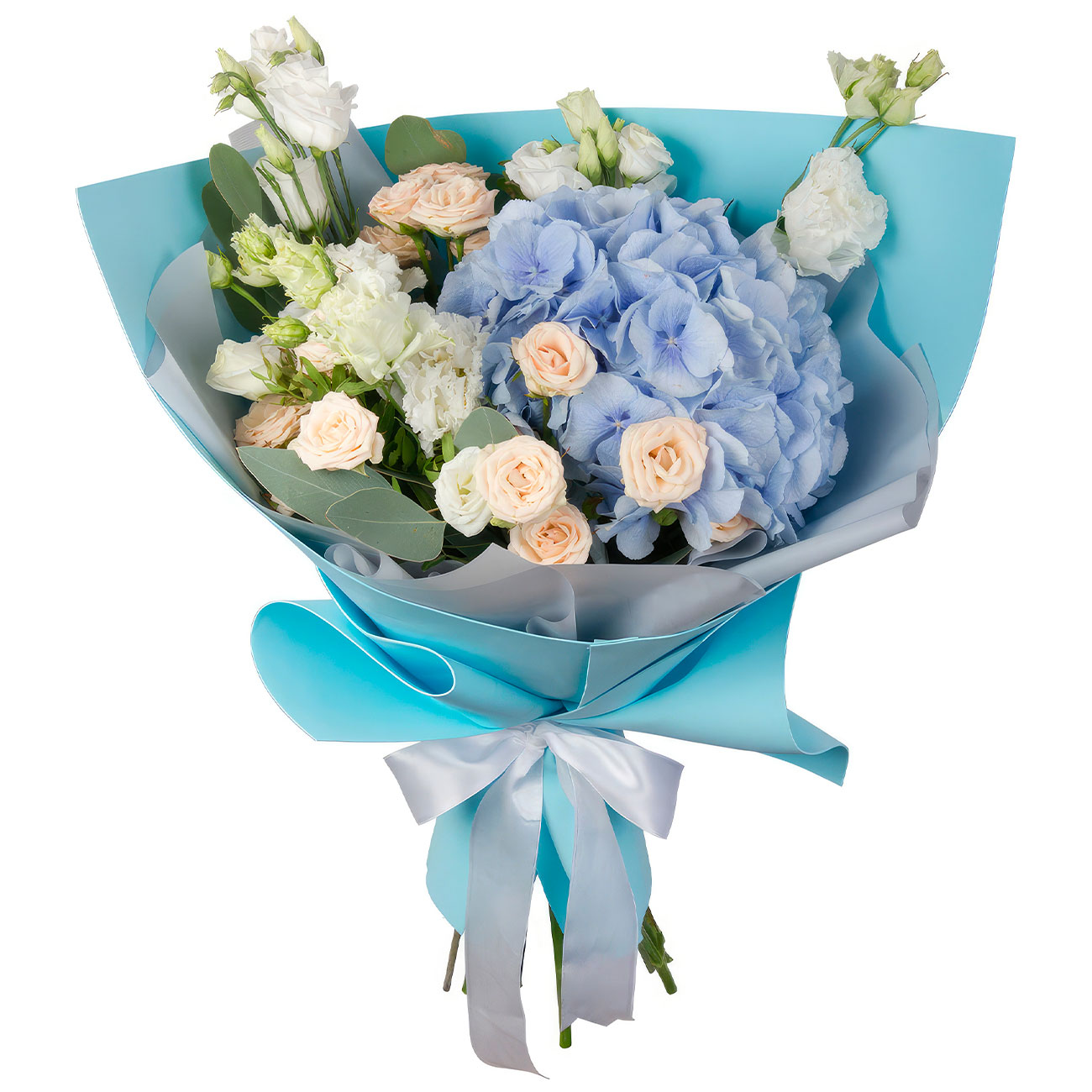 Лизиантус (эустома) белый, роза кустовая кремовая, гортензия голубая, эвкалипт. Упаковка (лента, пленка, крафт, сетка, пленка матовая)