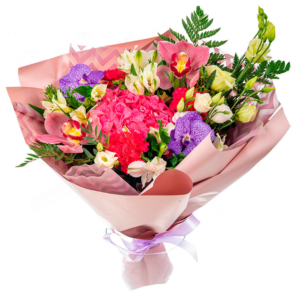 Орхидея розовая, ванда, гортензия розовая, эустома белая, альстромерия белая, зелень. Упаковка (лента, пленка, крафт, сетка, пленка матовая)