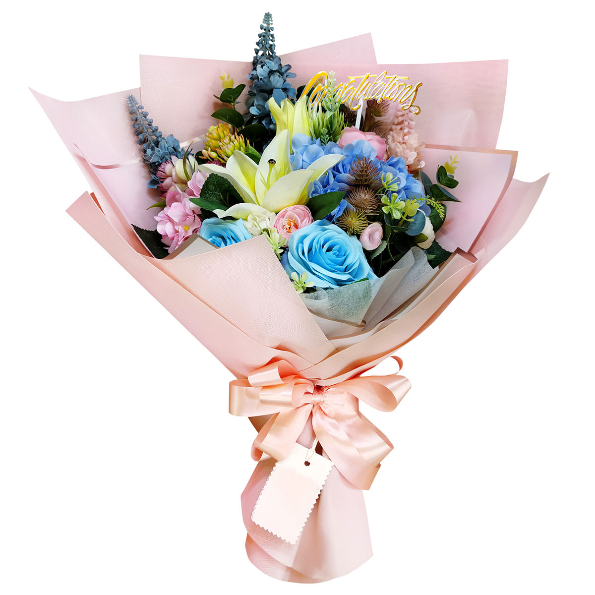 Гортензия голубая и розовая, лилия белая, роза одноголовая голубая, эрингиум, дельфиниум. Упаковка (лента, пленка, крафт, сетка, пленка матовая)