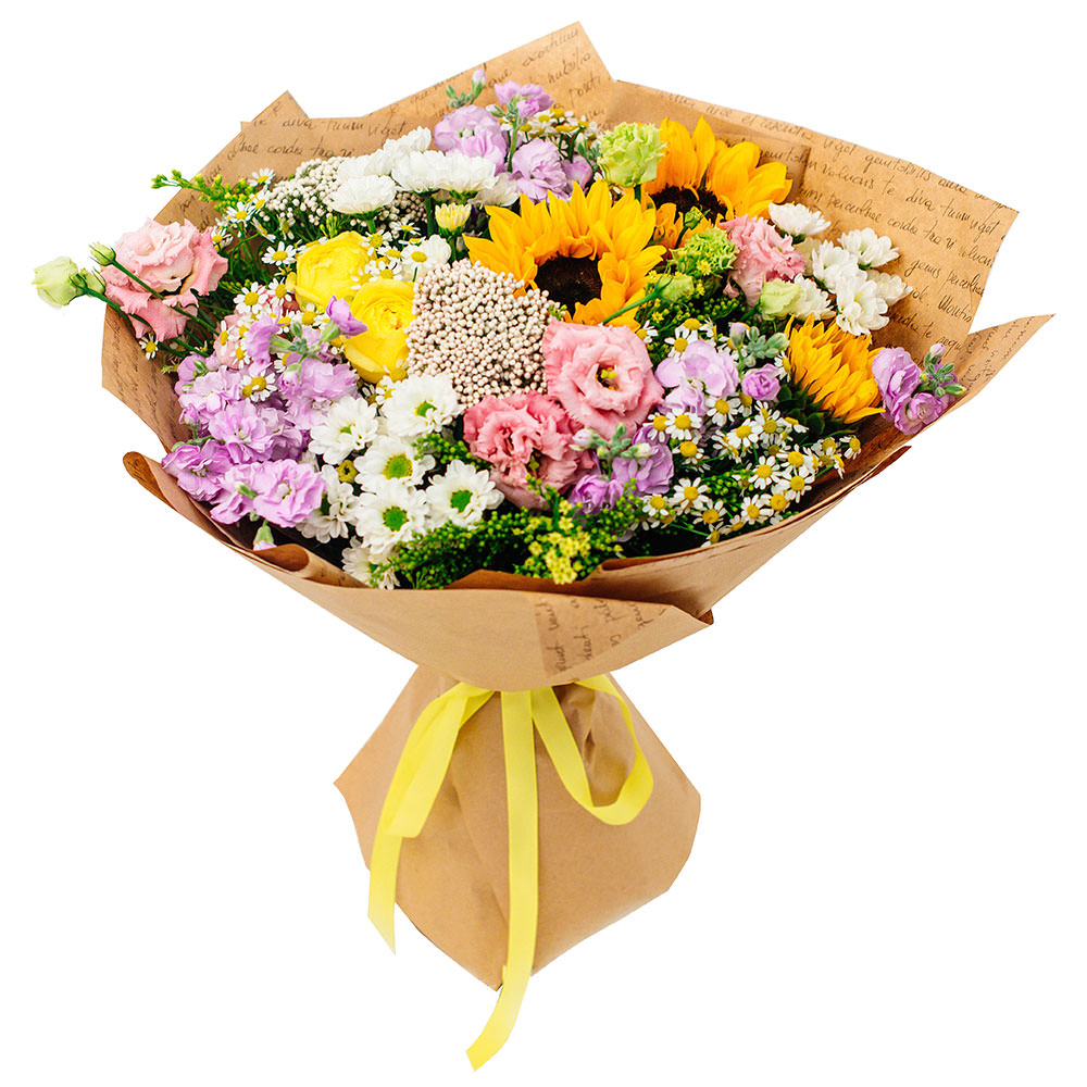 | Состав | Гвоздики, Матрикарии, Маттиола, Подсолнухи, Розы, Ромашки, Хризантемы, Эустомы |