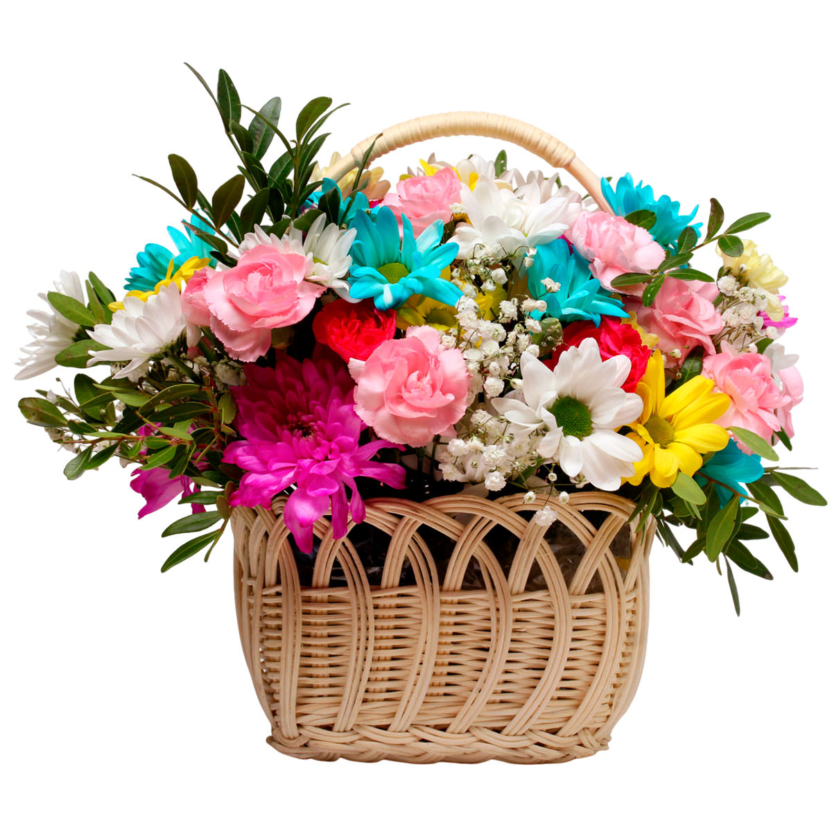 Хризантема разных цветов, гипсофила, фисташка. Упаковка (Корзина, оазис, ящик).