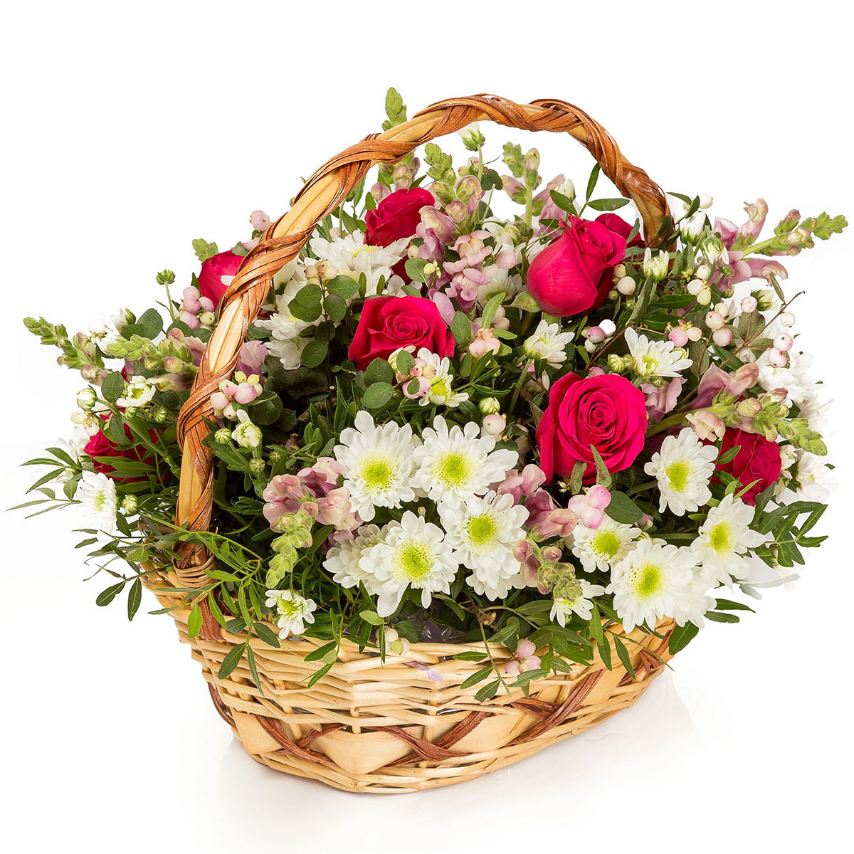 Роза одноголовая красная, хризантема кустовая белая, львиный зев, фисташка. Упаковка (Корзина, оазис, ящик).