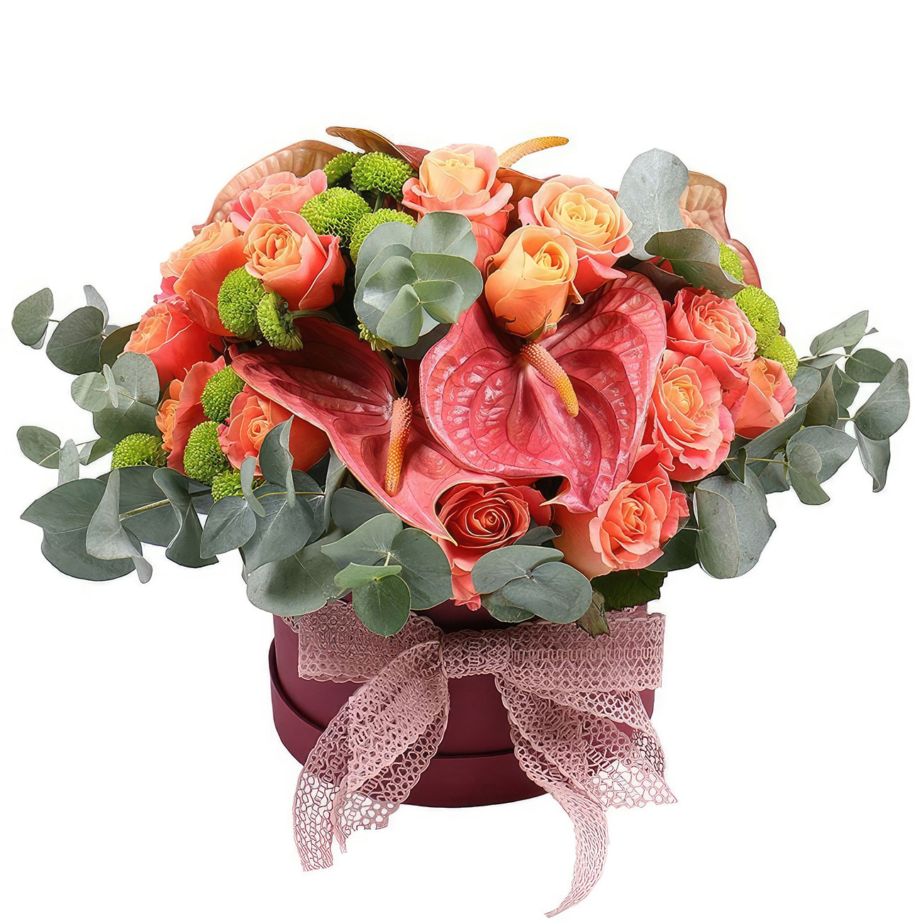 Антуриум, роза одноголовая коралловая, хризантема кустовая зеленая, эвкалипт. Упаковка (шляпная коробка, квадратный бокс, коробка сердце, оазис)