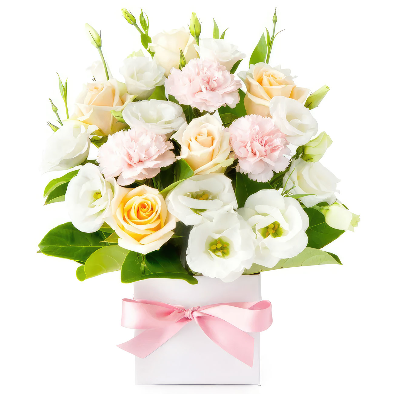 Эустома белая, роза одноголовая, гвоздика. Упаковка (шляпная коробка, квадратный бокс, коробка сердце, оазис)