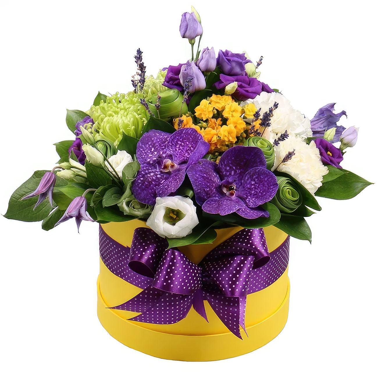 Орхидея ванда, хризантема одноголовая зеленая, эустома белая, диантус белый, клематис, зелень. Упаковка (шляпная коробка, квадратный бокс, коробка сердце, оазис)