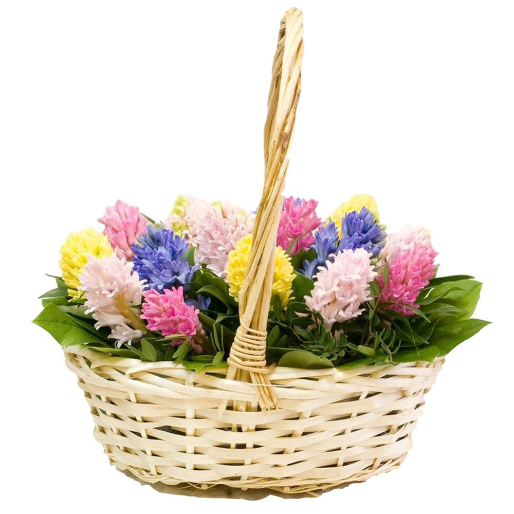 Гиацинты микс (розовый, желтый, голубой, белый), эвкалипт. Упаковка (Корзина, оазис).