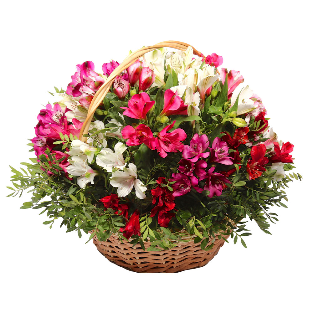 Цветы в корзинке «Краски альстромерий» с доставкой по г Городец: вы можете купить букет в гипермаркете цветов «Флормания» по цене от 3490 руб.